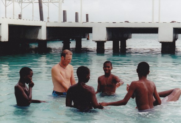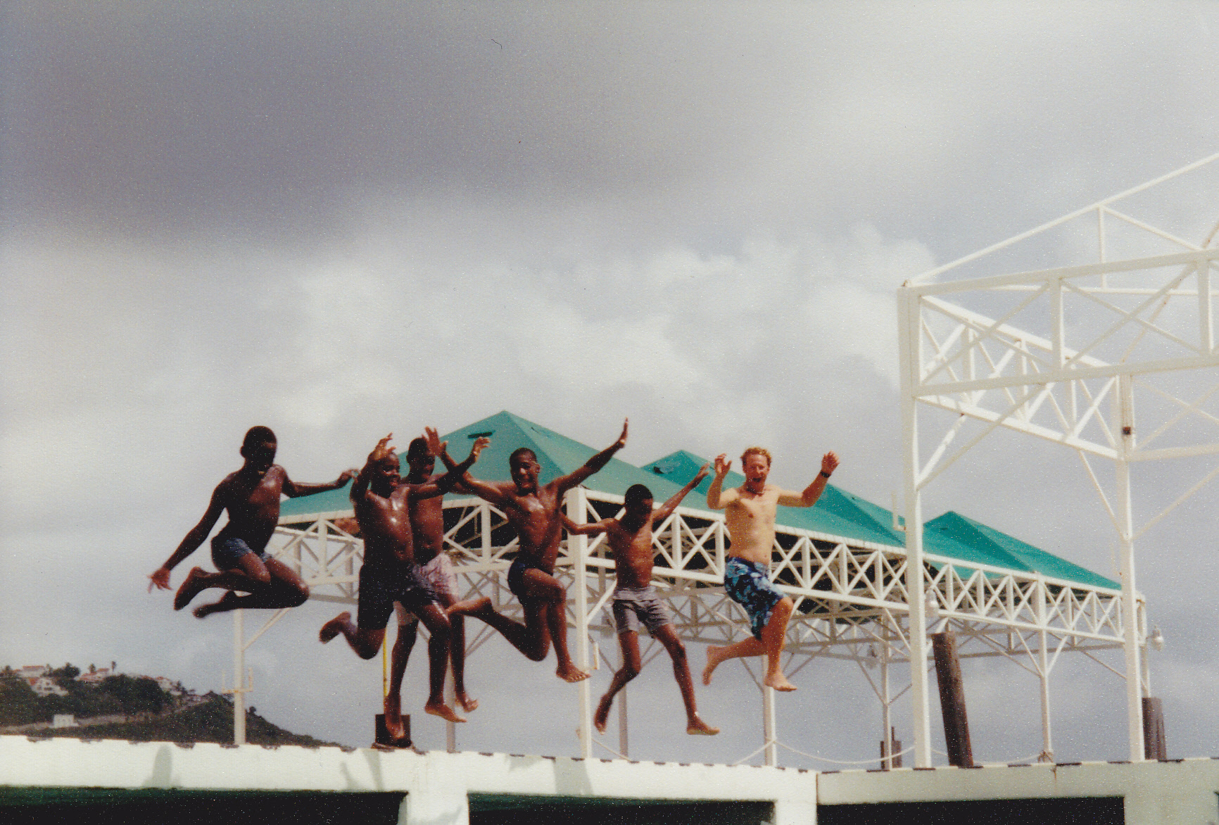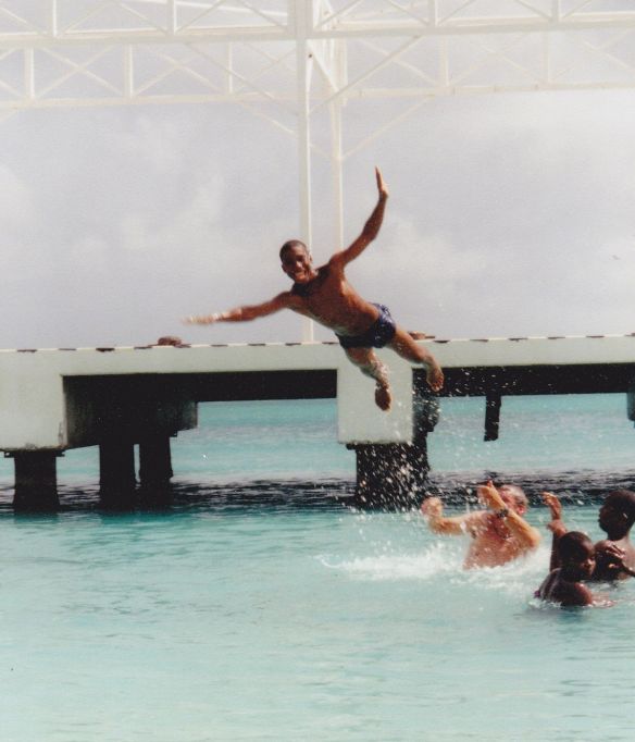 This series of photos is of my husband Kurt and some new friends he made while we were in St. Maarten. He saw some local boys doing jumps off a pier into the water. Pretty soon Kurt was jumping off the pier with them and then decided to launch them himself. I don’t know who had more fun.
