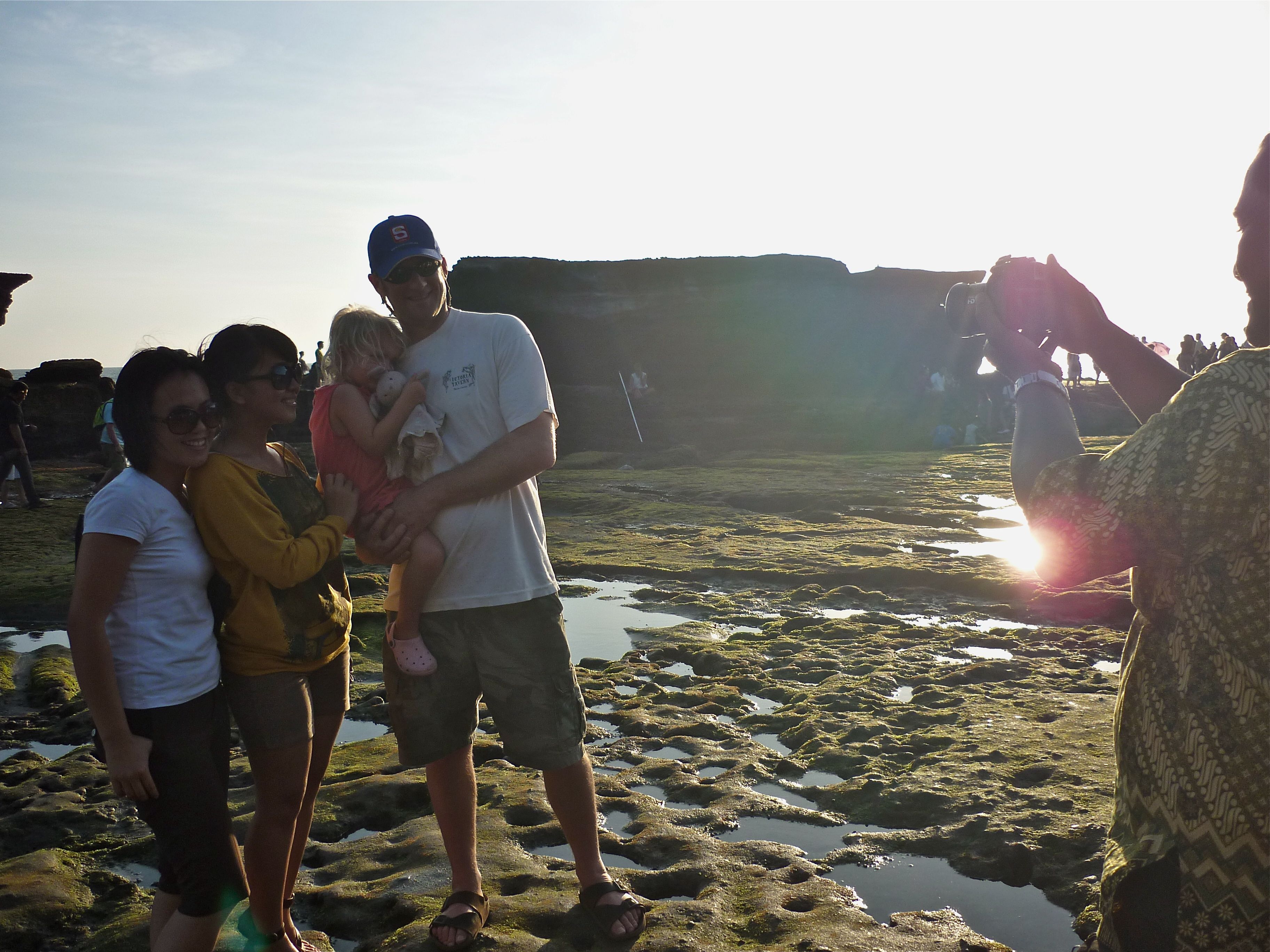 Feeling special with the rice clusters on our foreheads, Kurt and I felt even more impressive because our kids, Eddie and Kasey, were a big hit with Asian tourists. Various people stopped to say “hello” to the kids. An Indonesian family even asked to pose for a photo with three-year-old Kasey. I came up to the scene after looking for shells with Eddie. Kurt (merely a prop) stood holding her with the family.