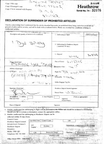 They are definite keepsakes since the language is just as civilized and polite as the experience was. One form, Heathrow Serial No. T4 32076 is categorized as a “Declaration of Surrender of Prohibited Articles” form. It states that: “articles confiscated for safekeeping at Heathrow Airport can be collected within 30 days…” (However, in my case, tear gas was not kept safely. It was scheduled for “disposal.”)