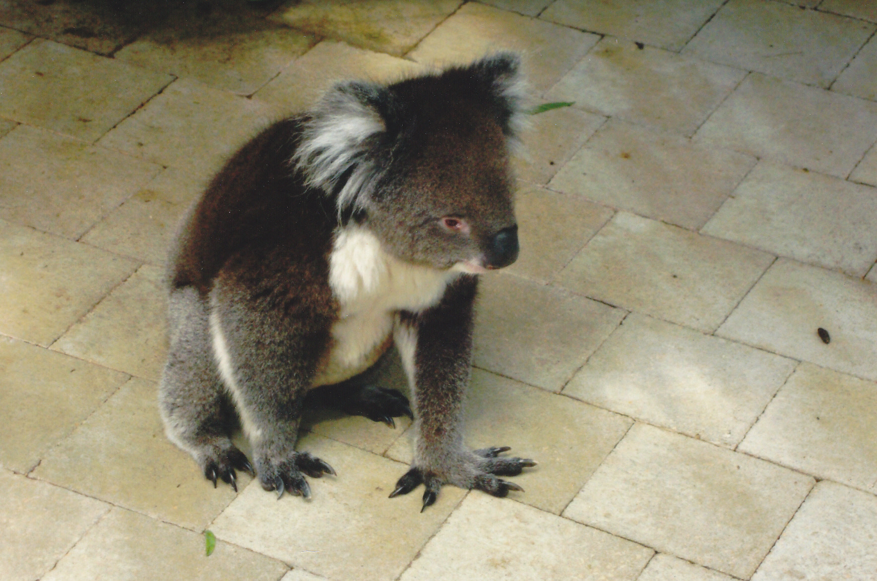 Roxy, one of the keepers, brought out a refreshed koala, Arthur, for me to hold. Arthur was much bigger than I expected a koala to be. I had put on this heavy green smock — sort of like the lead apron you wear during an X-ray. It made sense since koalas have incredibly sharp claws to climb eucalyptus trees. I got a good look at the claws. Definitely, evisceration of any opponent or tourist would be no problem for a koala.