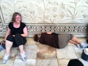 Jane lying down, in obvious discomfort, on the tiles of the Taj Mahal.