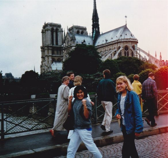 My friend Indira and I walking in Paris with Notre Dame in the distance.