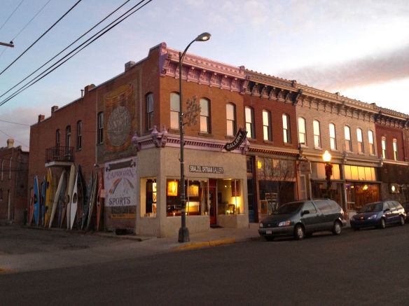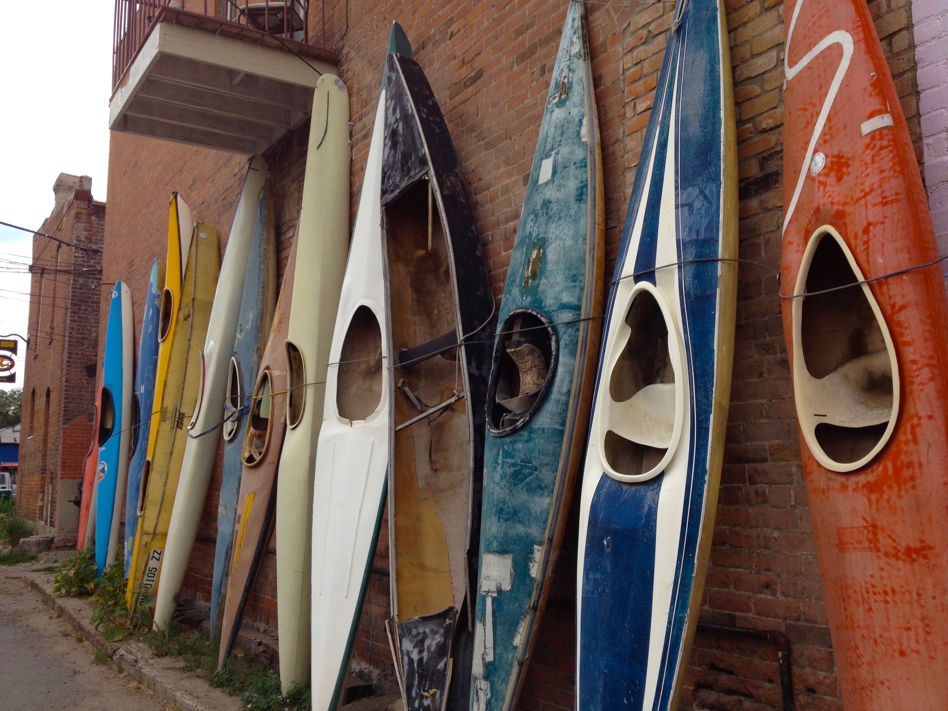 Salida, Colorado, USA. This is a classic, highly photographed scene in the small mountain town. The old school kayaks against an aging brick wall of a local building are postcard ready. Located along the Arkansas River, Salida, is a boating town (river rafting and kayaking), so this is a fitting image.