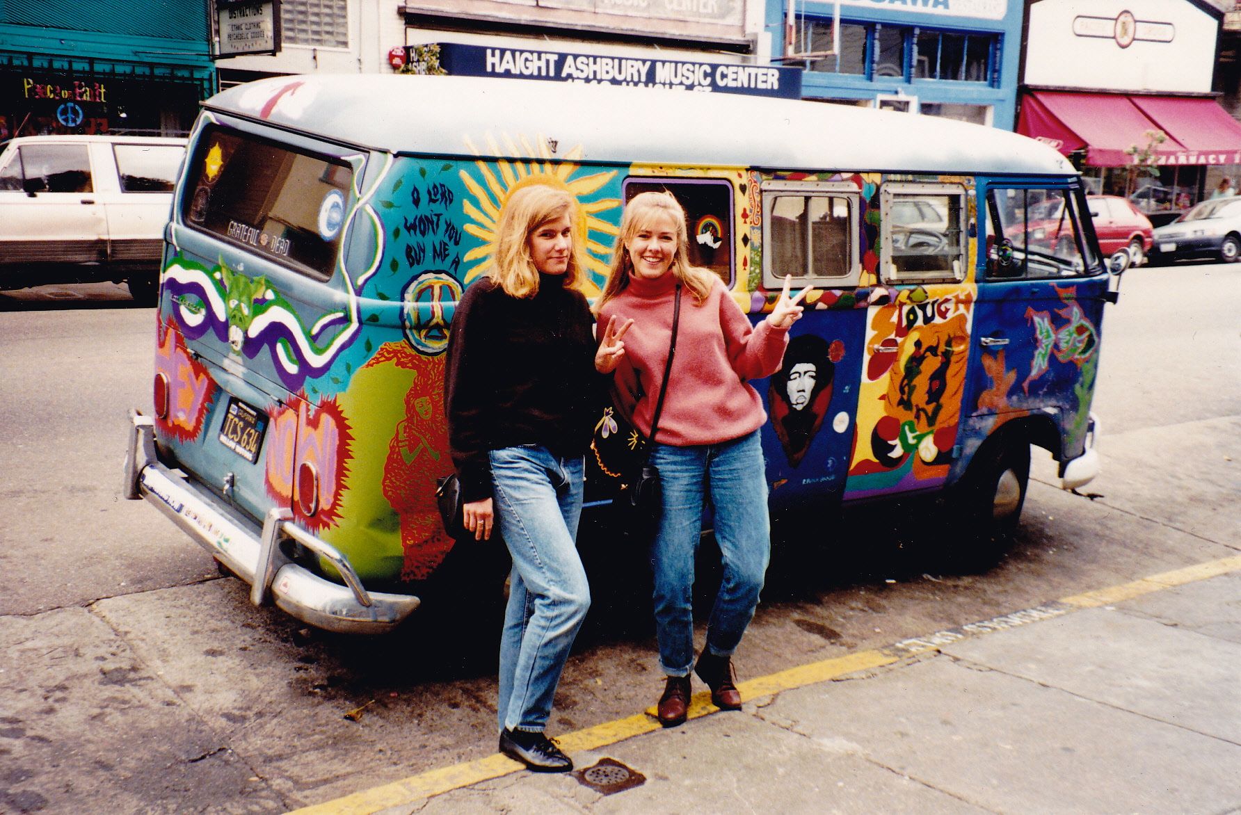 Haight Ashbury, San Francisco: Making a peace sign with a groovy Volkswagen micro minibus
