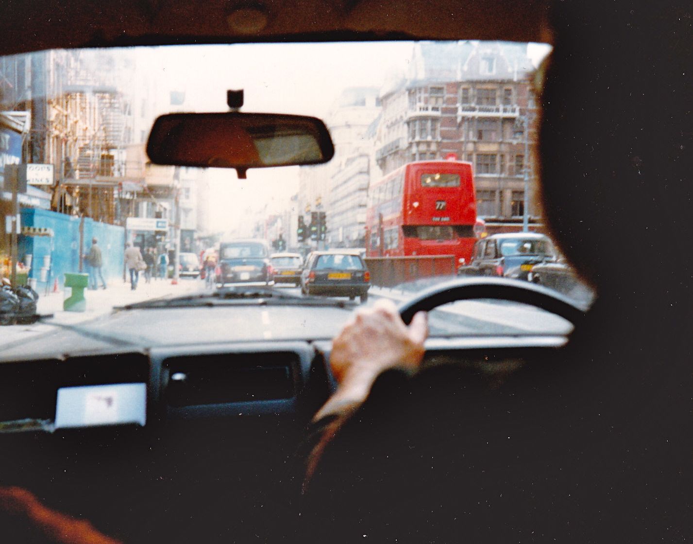 London, England. Riding inside a “black cab” while spotting a double decker bus.