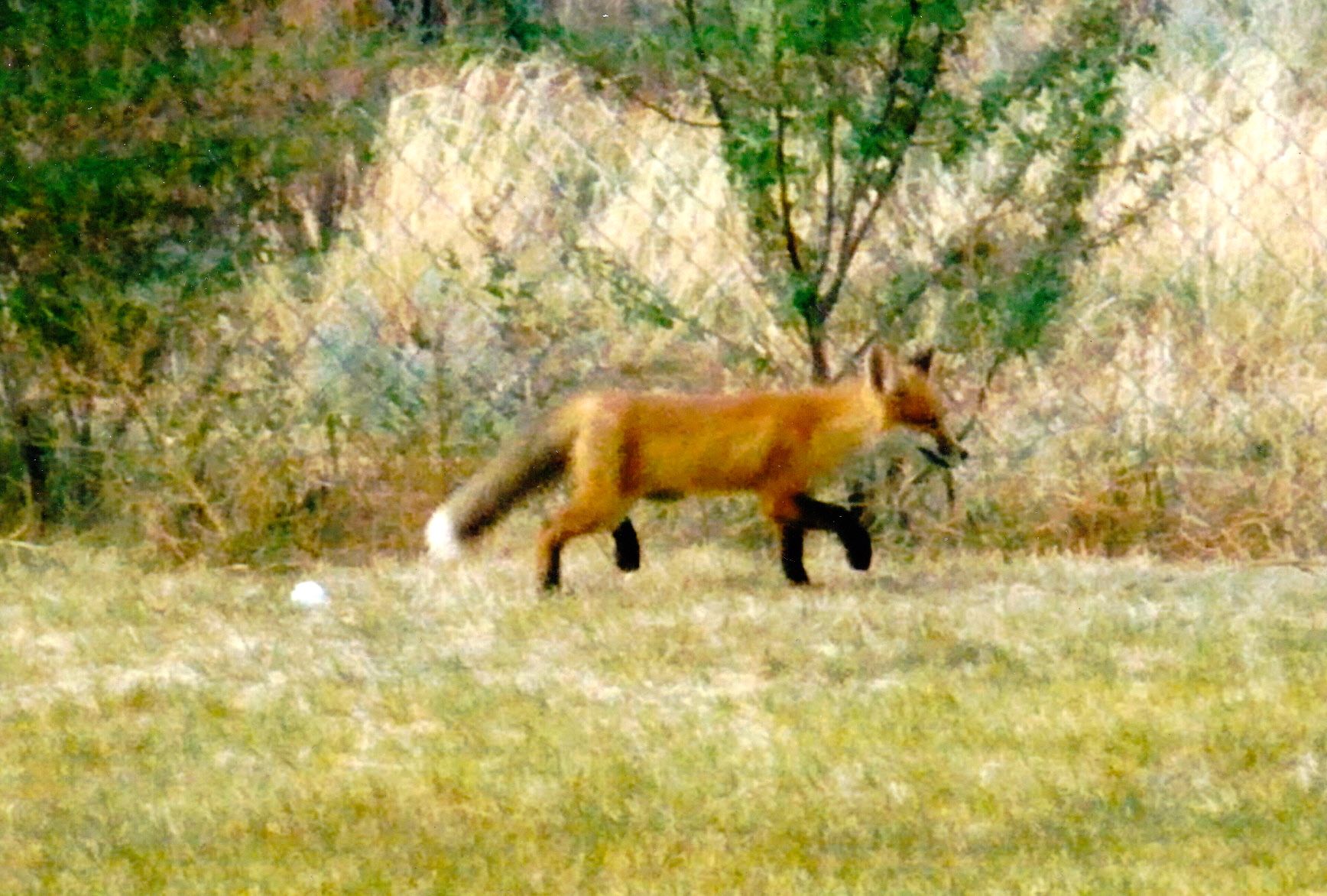 My backyard in Colorado, USA. This little fox kit was one of a litter that was born and lived in a den in the land behind our yard. They were all quite curious and often came close to the house.