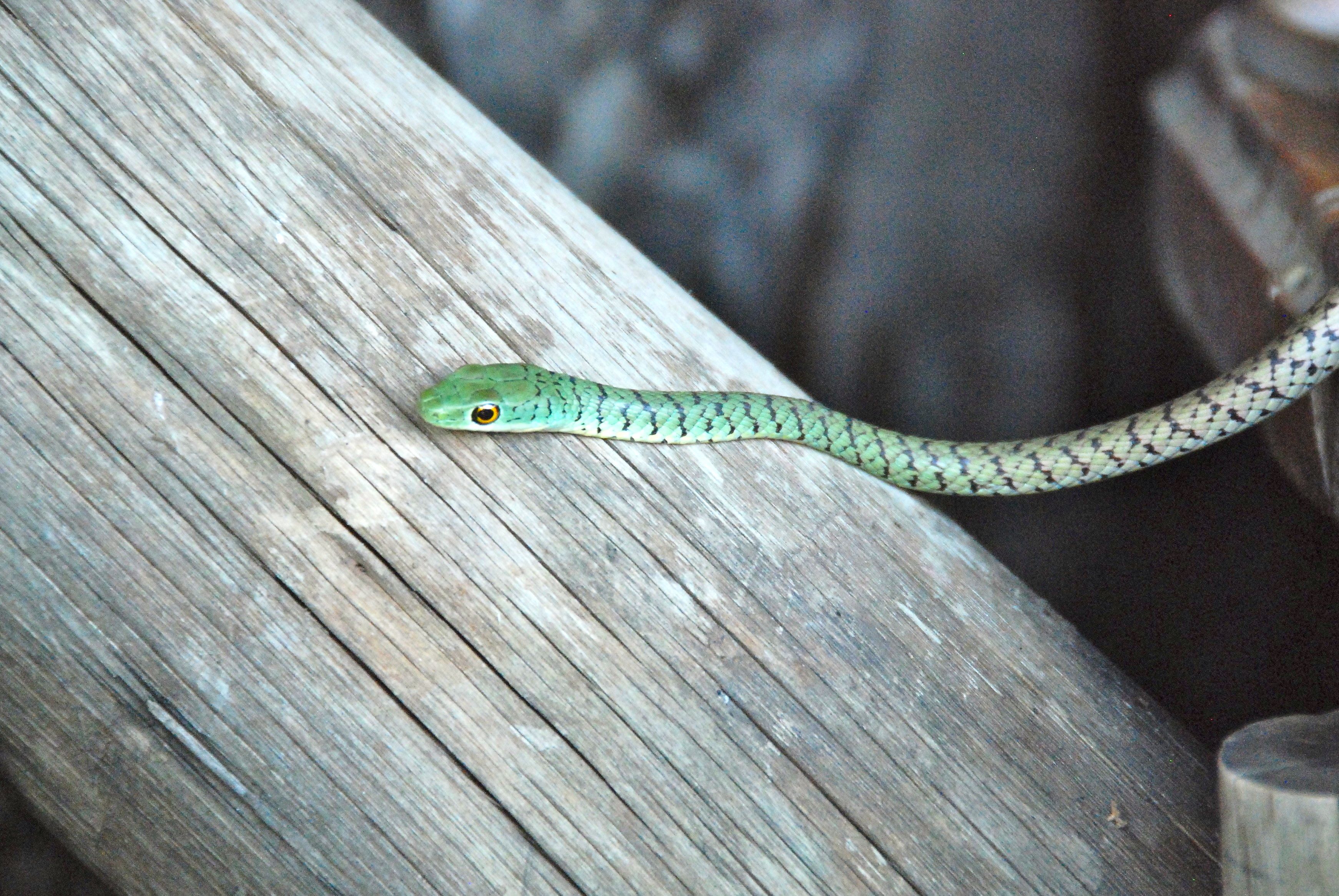 Tanzania, Africa. I’m not sure that I’d be psyched to see a snake in the African bush — especially a green one.