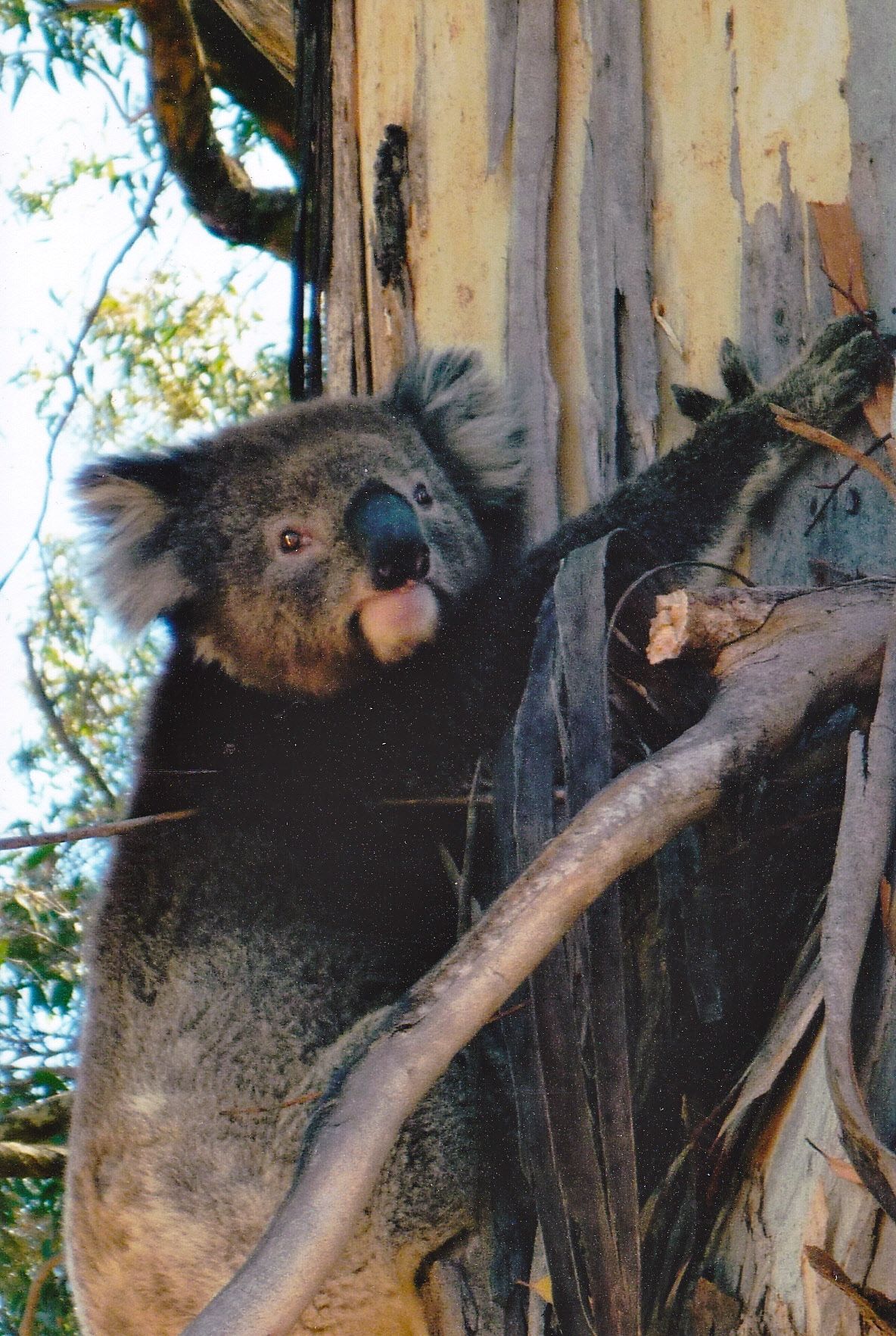 Adelaide, South Australia. We saw this koala shimmy up the eucalyptus tree with such speed that it was shocking. I had only seen them sleepy and rather inactive. After this guy went up the tree he began barking and making a huge ruckus. We could only guess he was trying to impress the ladies.