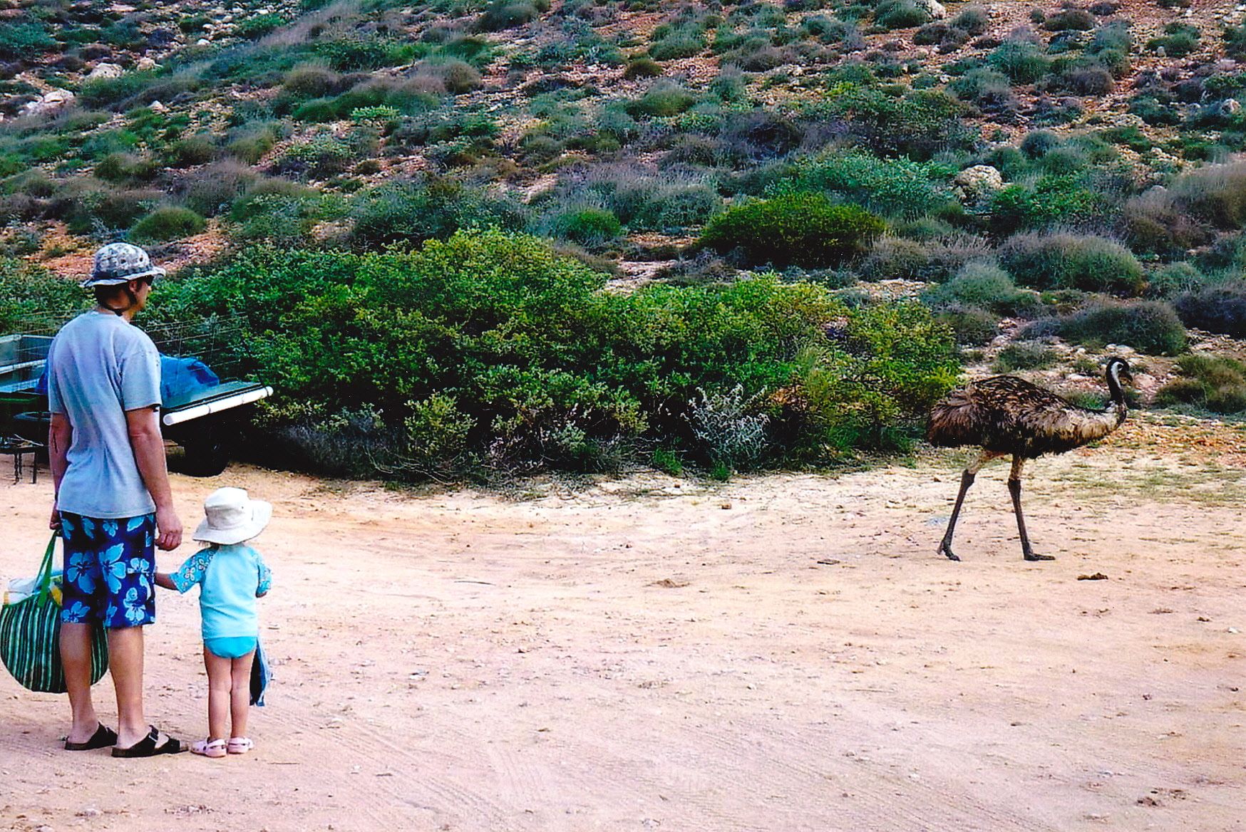 Exmouth, Western Australia. My kids, Eddie and Kasey, spotted this emu and tried to wave him down as he wandered around by the caravan park where we stayed.