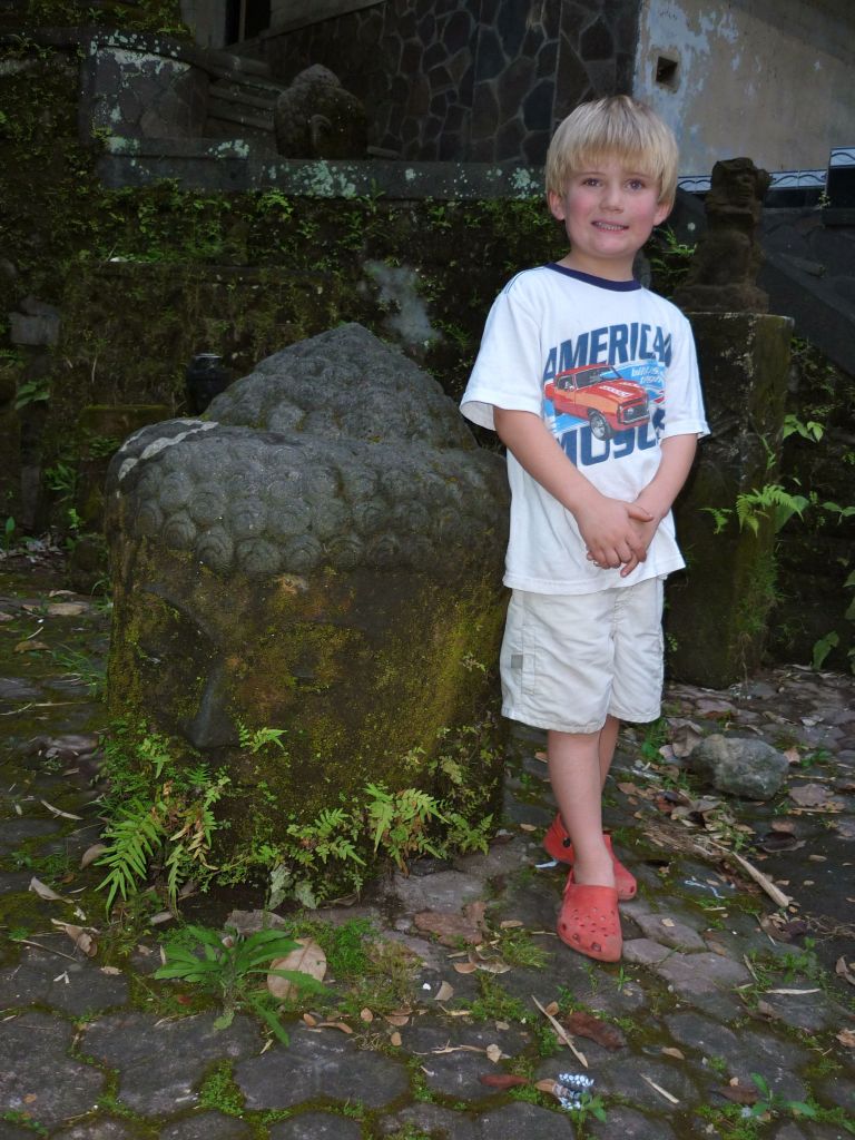 eddie by a buddha head Published March 6, 2013 at 2736 × 3648 in Travel Oops: Interrupting the Rapture — Roosters in Bali © Stephanie Glaser 2010
