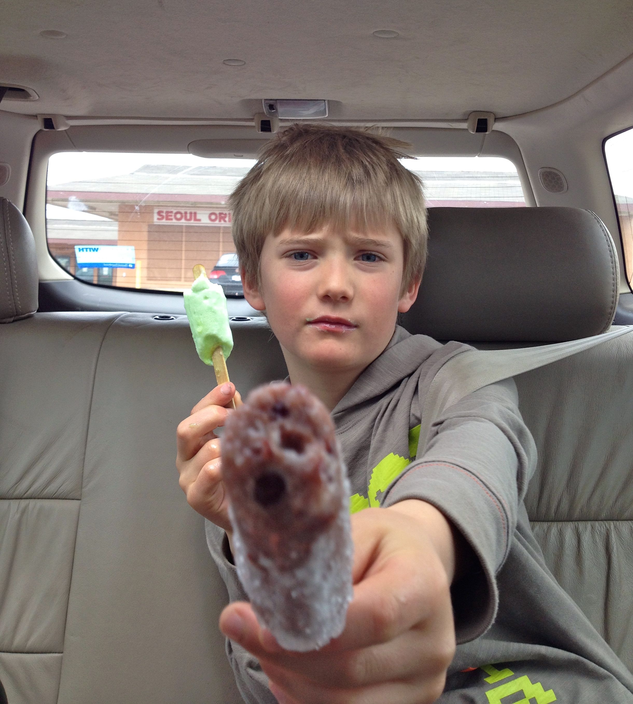 When Eddie and I get back to the car, we dig into some of our items. The red bean ice pop doesn’t cut it for Eddie.
