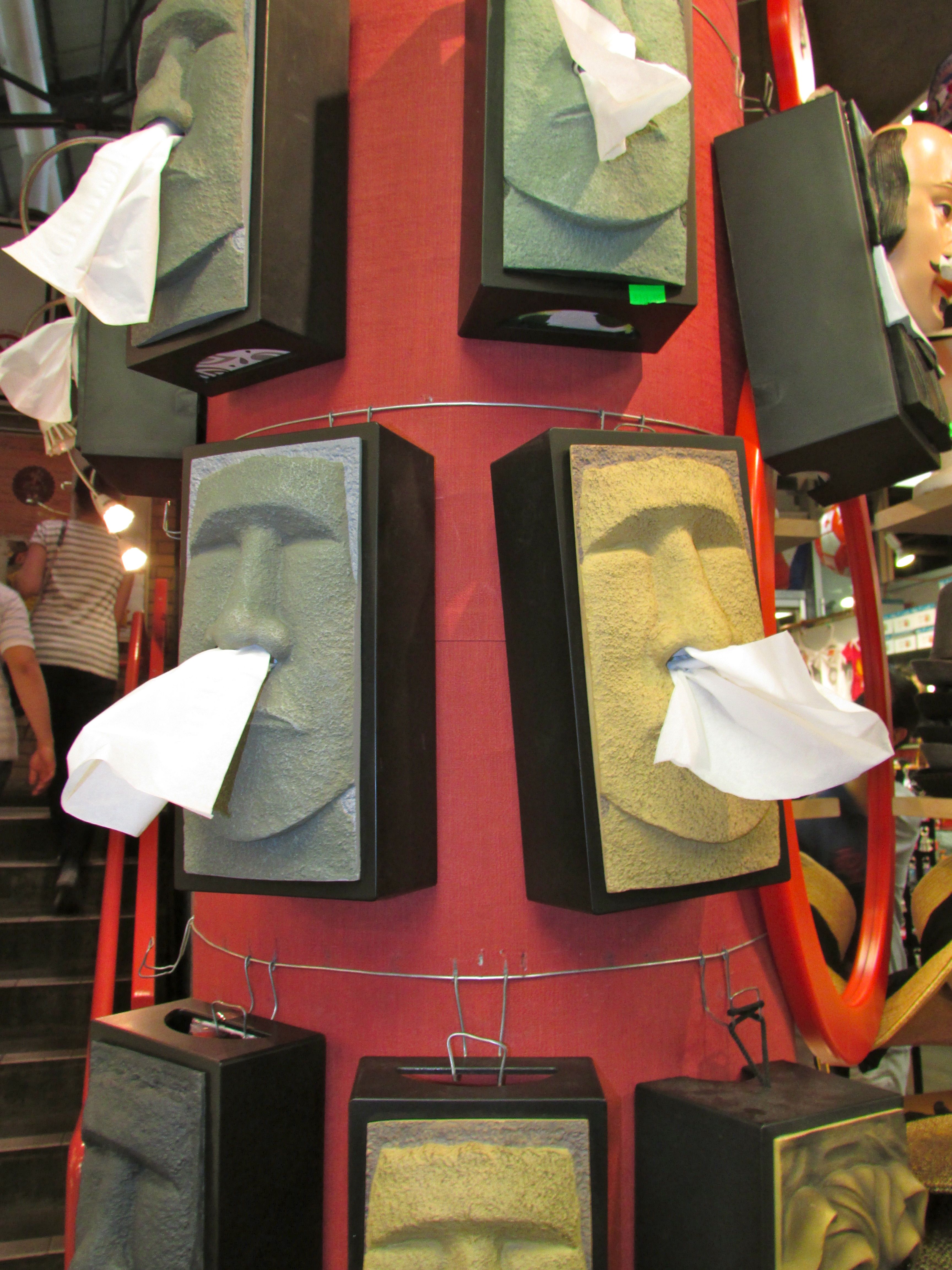 I’m sure the Rapa Nui, the mysterious builders of the Moai, had to battle with sniffles from time to time, so they would probably appreciate that, now, versions of their statues conveniently hold tissues in the nostrils.