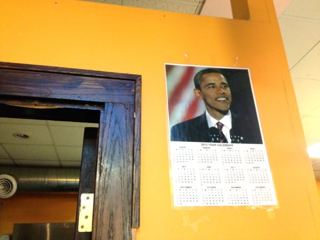 The bright orange walls gave the whole place a warm feeling. And while the spices emanating in the air from the sizzling grills were new to me, a President Obama calendar hanging on the wall by one food stall’s cash register lent a familiar feeling to the court. In addition to watching the news, Muslim men in white prayer caps sat, reading newspapers and playing cards. Several of the patrons sported an orange tint in their beards.