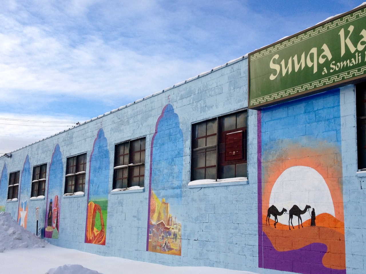 It’s an “I’d-like-to-teach-the-world-to-sing-in-perfect-harmony” moment, and I’m on a giddy global high. About 30 minutes earlier, I had trudged with my dad through the sloppy, tire-churned-up Uptown snow toward Suuqa Karmel, a Somali market in Minneapolis. The powder blue concrete complex with colorful murals of dessert scenes, including a camel caravan and palm trees, definitely seems out of place since snow banks jut up from the sidewalk leading to the entrance.