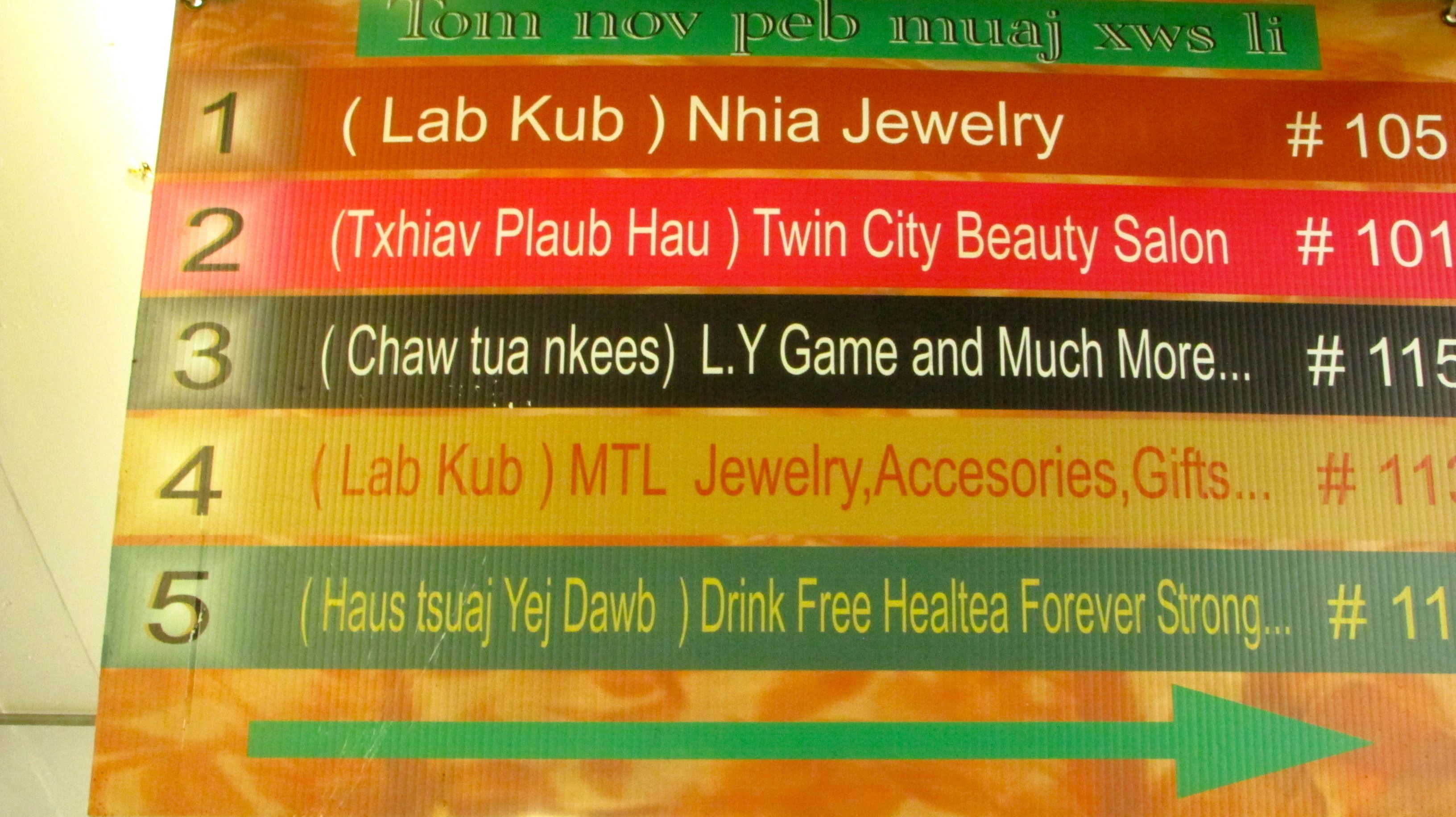 Arriving in the early evening on a Saturday, Eddie and I wandered around the marketplace. Indeed, it actually felt like we were in Southeast Asia. Traditionally, the Hmong have not had a written language, but we saw signs that read: Txhiav Plaub Hau (Twin Cities Beauty Salon) and Haus tsuaj Yej Dawb (Drink Free Heal Tea Forever Strong) and Chaw tua nkees (L.Y. Game and Much More)