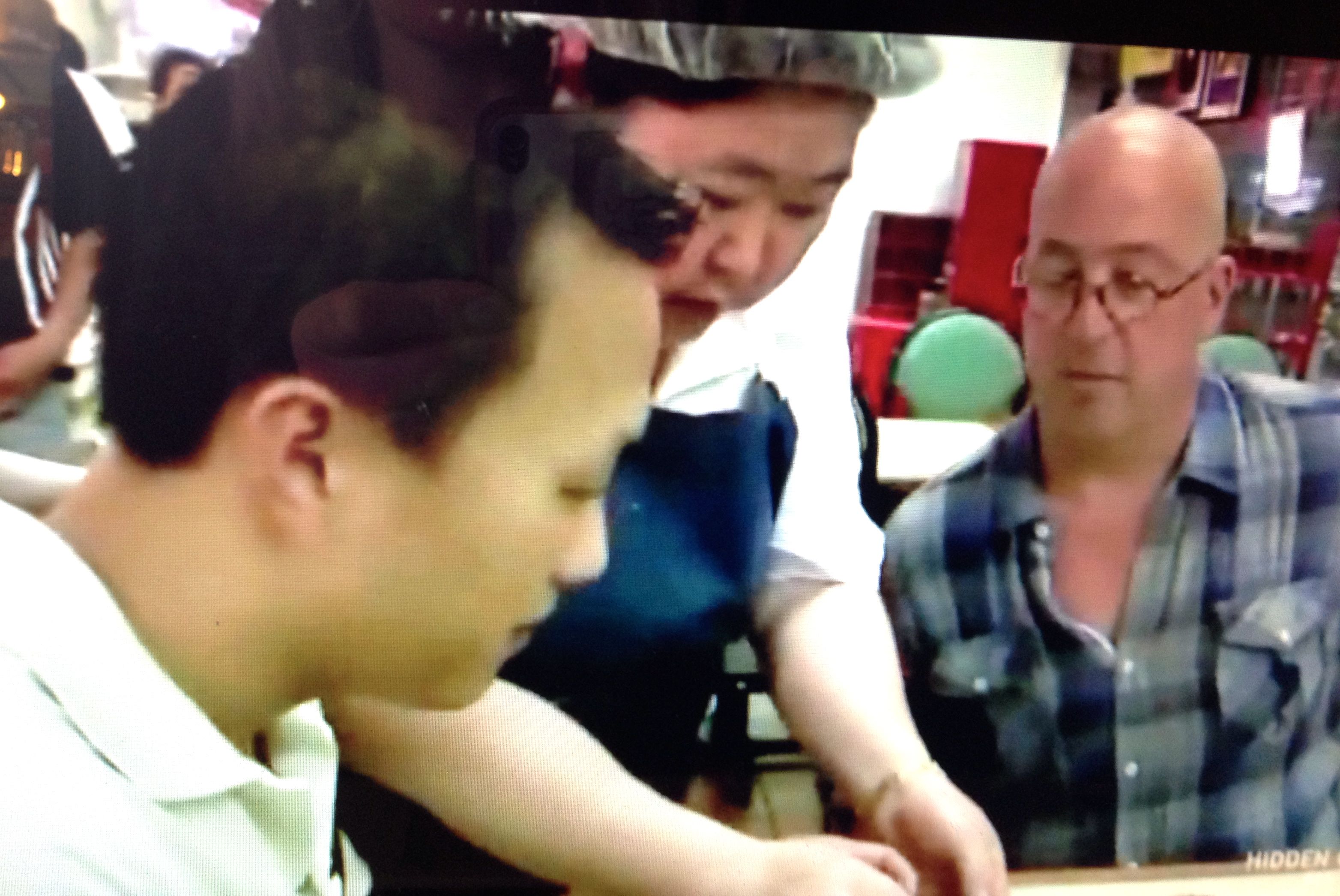 Over standard white button down shirts, they both wear matching black aprons with Southeast Asian style embroidered trim. Young has fashioned her white shirt into a ripped sleeveless look, and she wears a hot pink tank top underneath. It is the same hot pink as the smart phone she had been texting on earlier during her brief break.