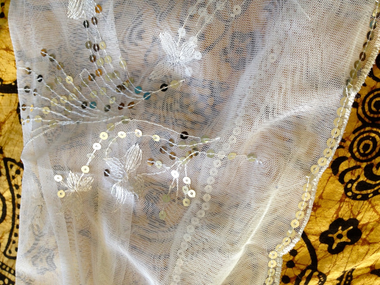 A complete sucker for scarves, I eye a pretty white one with a sequined design. I set the beach bag down and feel the gauzy material. Kurt comes over with a pirate ship kite for which he already settled on a bargain price.