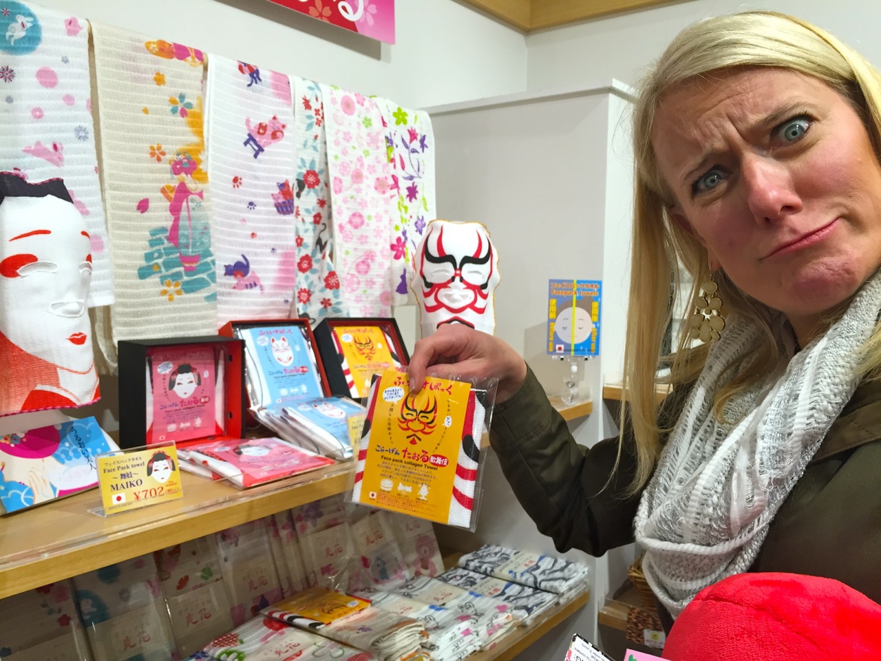 What is this? Published July 19, 2016 at 1280 × 960 in Discoveries in the whimsical, swirly, Technicolor, mystifying, sweet, savory, wacky land of wonder that is Japan In an Osaka gift shop, Suz tries to figure out what the heck this face mask thing is.