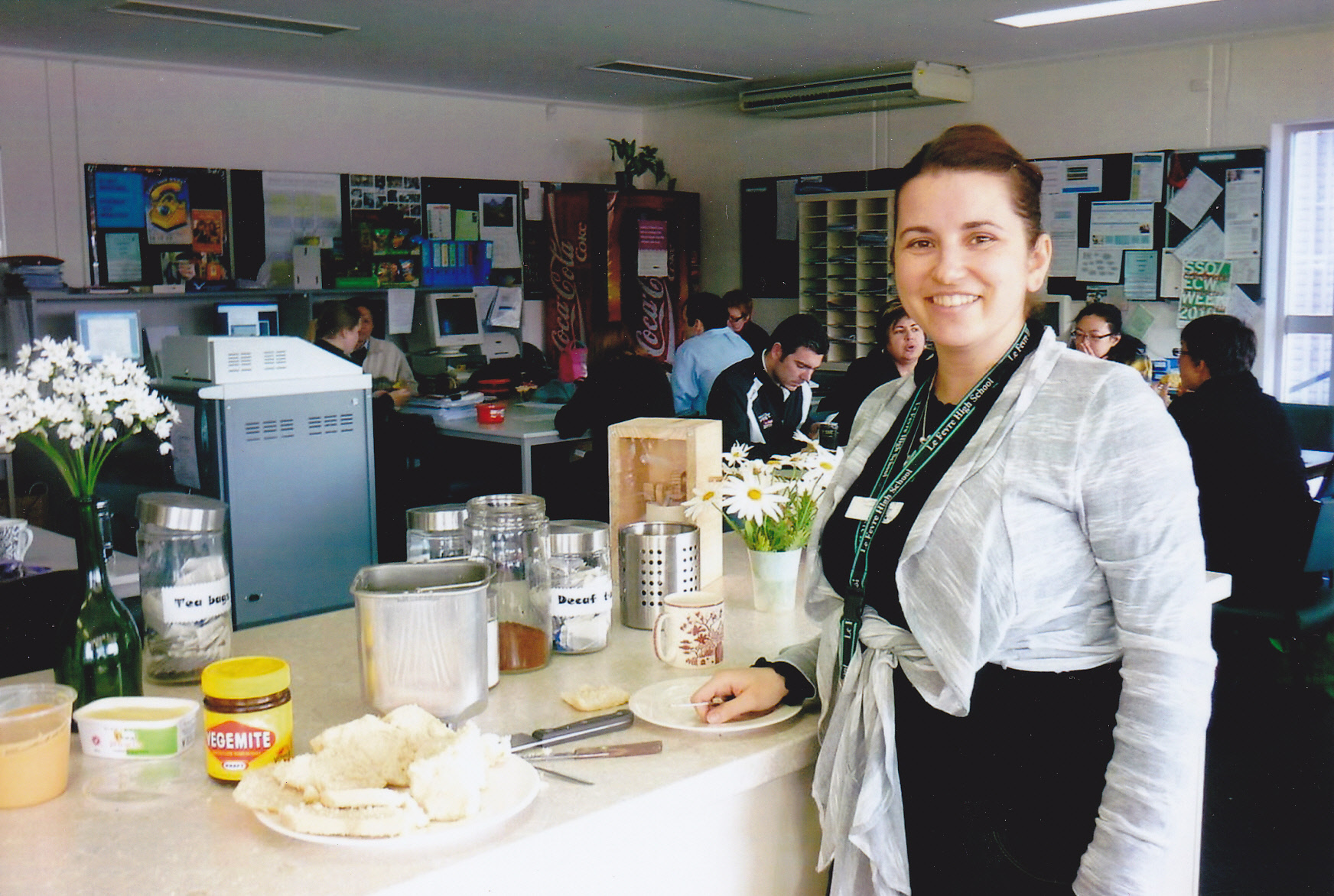 Nadine with everything she needs to convince me of the wonder of Vegemite.