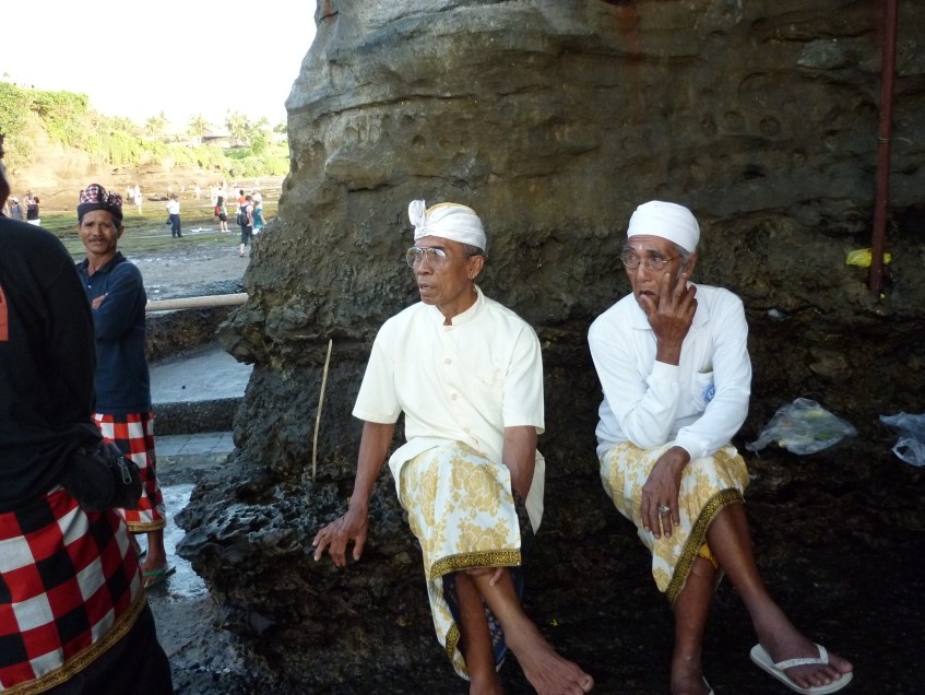 P1000497 Published June 29, 2012 at 2560 × 1920 in P1000497 Two Hindu holy men take a break from giving rice blessings at Bali’s Tanah Lot temple. Photo: