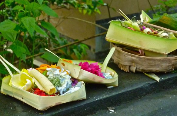 Even at our hotel in Sanur, Bali, we saw a lifeguard place a “Canang Sari” and sticks of incense on the cement pool deck near the waterside. These simple but beautiful baskets are traditional offerings meant to thank the Hindu gods, and you see them everywhere in Bali.